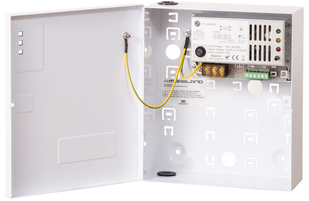 Deze schakelende voeding in plaatstalen kast levert een gestabiliseerde gelijkspanning van 12 VDC en 1,5 ampère. Dit zorgt voor een constante uitgangsspanning. Voorzien van led indicatie, aansluiting voor een accu (noodstroomvoorziening), sabotagecontact en keuzeschakelaar voor 12V of 13,8V. De kast wordt geleverd met een 1,5 meter lange randaarde netsnoer met haakse stekker. Fraai voedingskastje nabij de elektrisch vergrendelde deur, boven het plafond, in de meterkast of techniekruimte op de wand gemonteerd. Het elektrische slot kan tezamen met de kaartlezer (codeslot) op de voeding worden aangesloten.