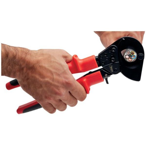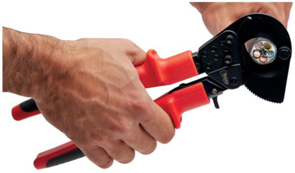 Super handige en sterke kabelkniptang. Mooi voor je elektroproject voor het doorknippen en inkorten dikke voedingskabels tot 32 mm rond. Met zijn ideale lengte van 29 cm, sterke snijbekken, ratel en soepele handgreep, kun je de kabels zonder al te veel kracht doorknippen. Vergeet niet om regelmatig het aandrijfmechanisme van de lemmetten te smeren. Let op! Neem altijd de kabeldiameters en aanbevolen maximale doorsneden in acht.