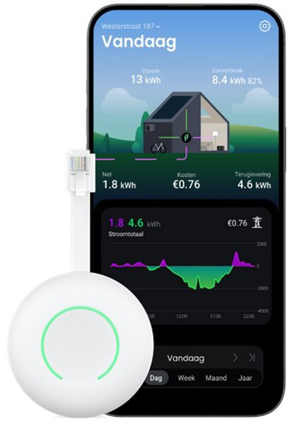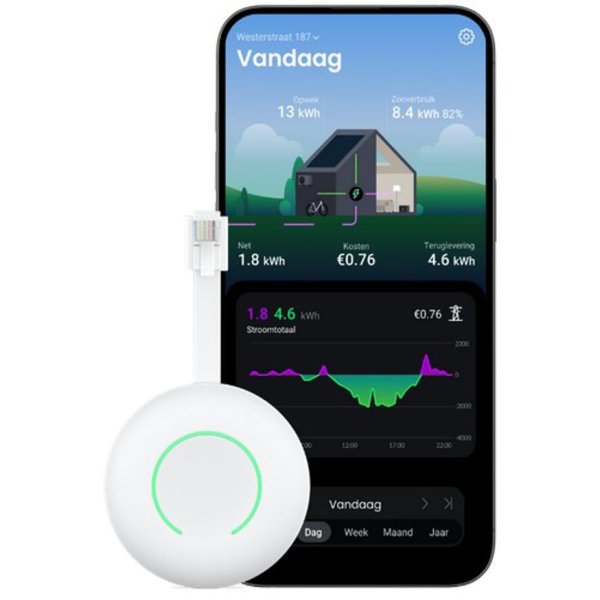 De P1 Meter klik je in de P1-poort van je slimme meter en ziet het stroomverbruik, teruglevering en gas van jouw woning. De P1 Meter werkt met alle slimme meters! Klik, verbind met wifi en klaar. De P1 Meter ziet via de slimme meter ook het gasverbruik van je woning. Zo zie je precies hoeveel gas jij gebruikt tijdens het douchen. kijk live of terug in de tijd. geschiedenis van 12 maanden. De HomeWizard P1 meter maakt dynamische load balancing mogelijk voor Peblar / Alfen laadpalen. Door directe koppeling met de slimme meter via de P1-poort, meet de P1 meter continu het totale energieverbruik in de woning. Op basis hiervan past de laadpaal automatisch het laadvermogen aan, zodat overbelasting van de hoofdaansluiting wordt voorkomen. De installatie is eenvoudig (plug & play) en vereist geen aanpassingen in de meterkast. De meter werkt via WiFi en biedt daarnaast ook inzicht in stroomverbruik en teruglevering via de HomeWizard app.