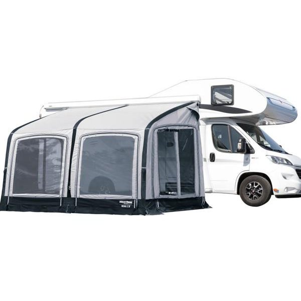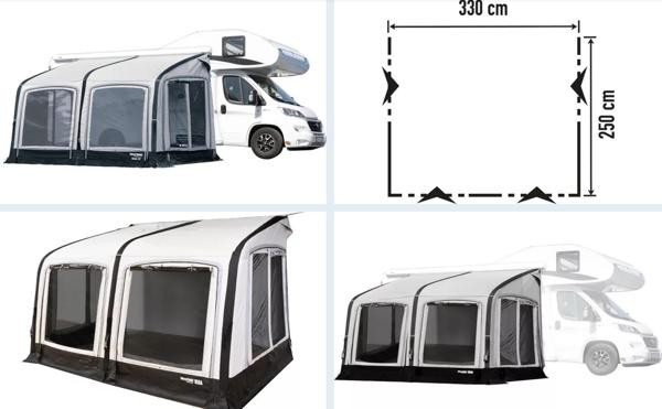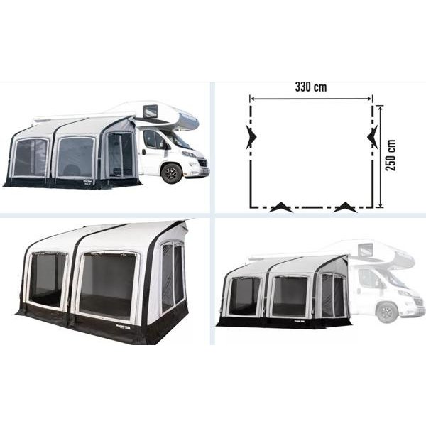 VEGA 330, met zijn nieuwe kleuren en design, is de perfecte keuze voor kampeerders die veel reizen en vaak van locatie veranderen, omdat de luchtvoortent heel snel opgezet en afgebroken kan worden. De luchtbuizen zijn zo ontworpen dat de hele voortent een optimale stahoogte heeft naast de 250 cm voortentdiepte. Dit garandeert een perfecte benutting van de ruimte en veel plaats binnenin. Nog een voordeel: de panoramische ramen zorgen voor een bijzonder ruimtelijk gevoel. Hij is ook uitgerust met een aansluiting voor onze CANOPY SHADY PRO luifel.