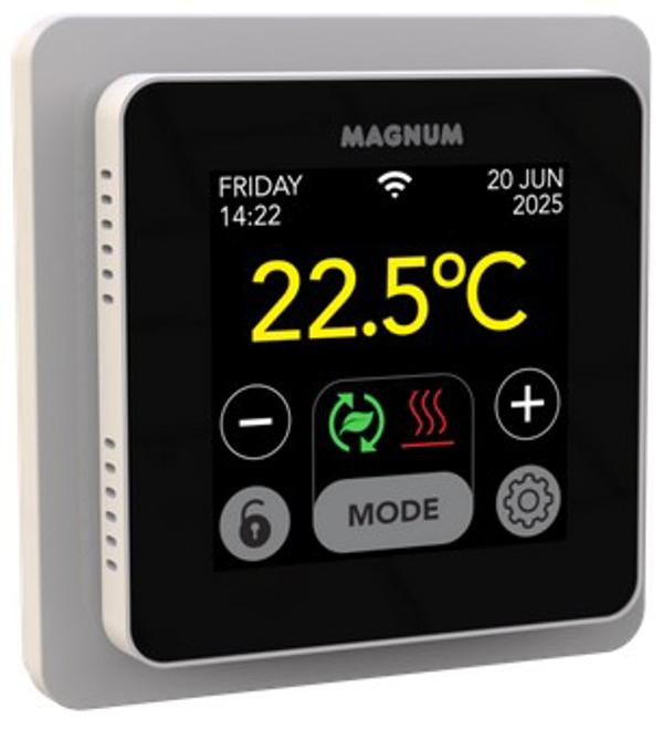 De MAGNUM Remote Control 2 (MRC2) is een slimme wifi-thermostaat en één van de meest geavanceerde modellen op de markt. De MRC2 is uitgerust met een groter display en een vernieuwde, intuïtieve gebruikersinterface die eenvoudig te bedienen is via het scherm of de bijbehorende app. De thermostaat beschikt over een energiebesparende ECO-modus met aanwezigheidssensor en ondersteunt software-updates via WiFi, zodat hij altijd up-to-date blijft. Slim geregeld -> De MRC2 berekent de verwarmingstijd zelf. Je hoeft alleen de periodes in te voeren waarin de ruimte warm moet zijn. Hij leert geleidelijk de ideale verwarmingstijd en past zijn programma automatisch aan. Dit maakt de MRC2 de perfecte en veilige oplossing voor elk elektrisch verwarmingssysteem. De MRC2 is eenvoudig te bedienen via het touchscreen op de thermostaat zelf. Daarnaast kun je hem op afstand bedienen met je smartphone via de app, beschikbaar voor zowel iOS als Android. De thermostaat is ook compatibel met de spraakassistenten van Google en Amazon. Zo kun je met je stem de temperatuur aanpassen of vragen wat de huidige vloertemperatuur is. Ideaal als je bijvoorbeeld in de auto zit en je telefoon niet handmatig kunt gebruiken. De MRC2 is ook te automatiseren met Siri Shortcuts (Opdrachten). Je kunt bijvoorbeeld door middel van je locatie of een zelf gekozen spraakopdracht aangeven dat de thermostaat op een bepaalde temperatuur ingesteld moet worden, de vorstvrij modus in laten schakelen bij een lage (lokale) buitentemperatuur of de vakantiemodus laten activeren als je een paar dagen niet thuis bent. De mogelijkheden zijn eindeloos.